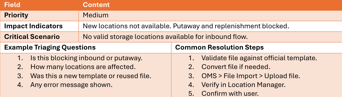 Each issue has an assigned priority based on their operational impact. In this case, we consider "Location Upload Failed" an issue of medium priority. See table below:
